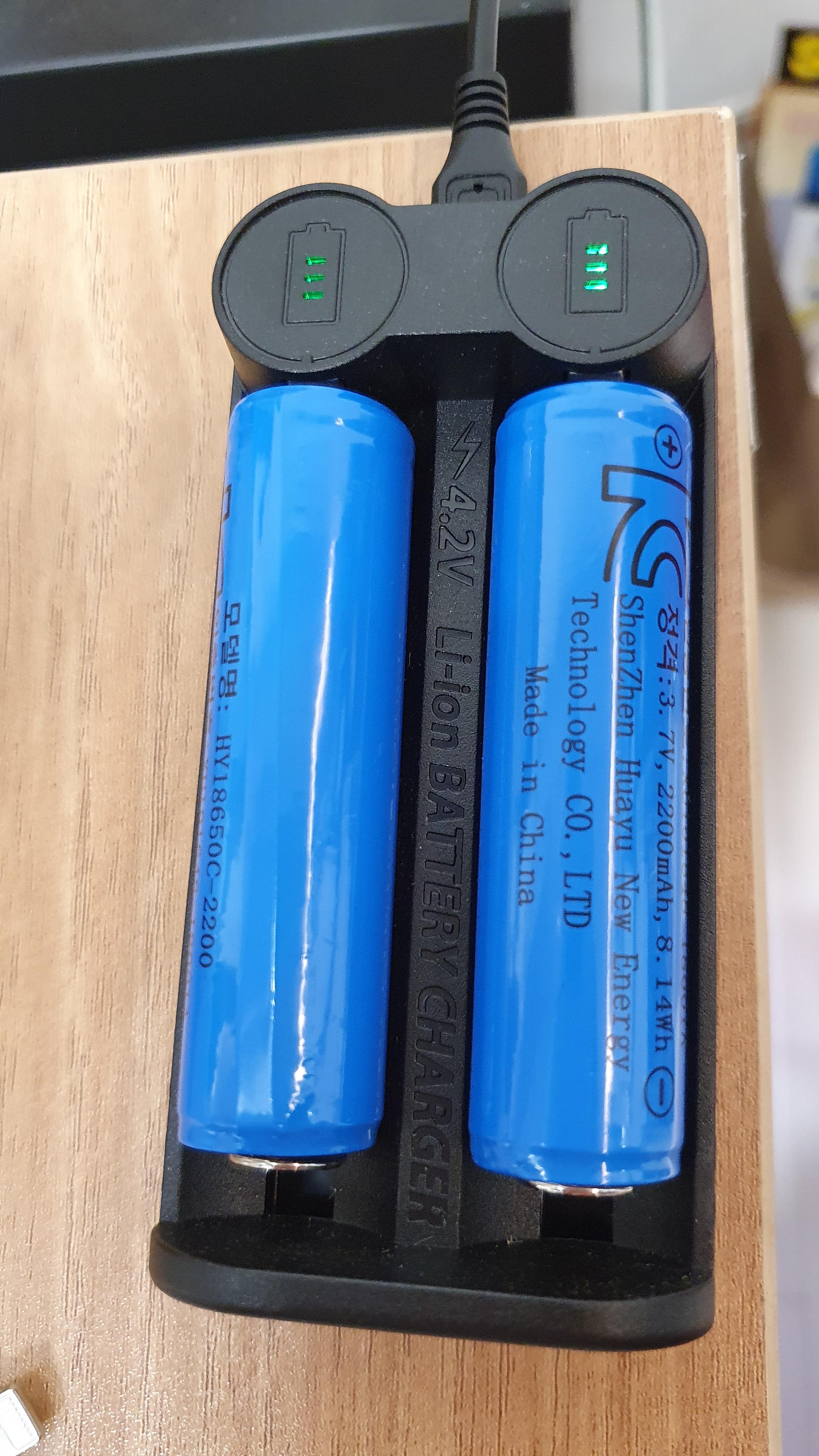 충전기는 아래와 같이 18650 규격의 배터리 2개를 동시 충전할 수 있는 크래들과 충전용 어댑터가 제공된다.