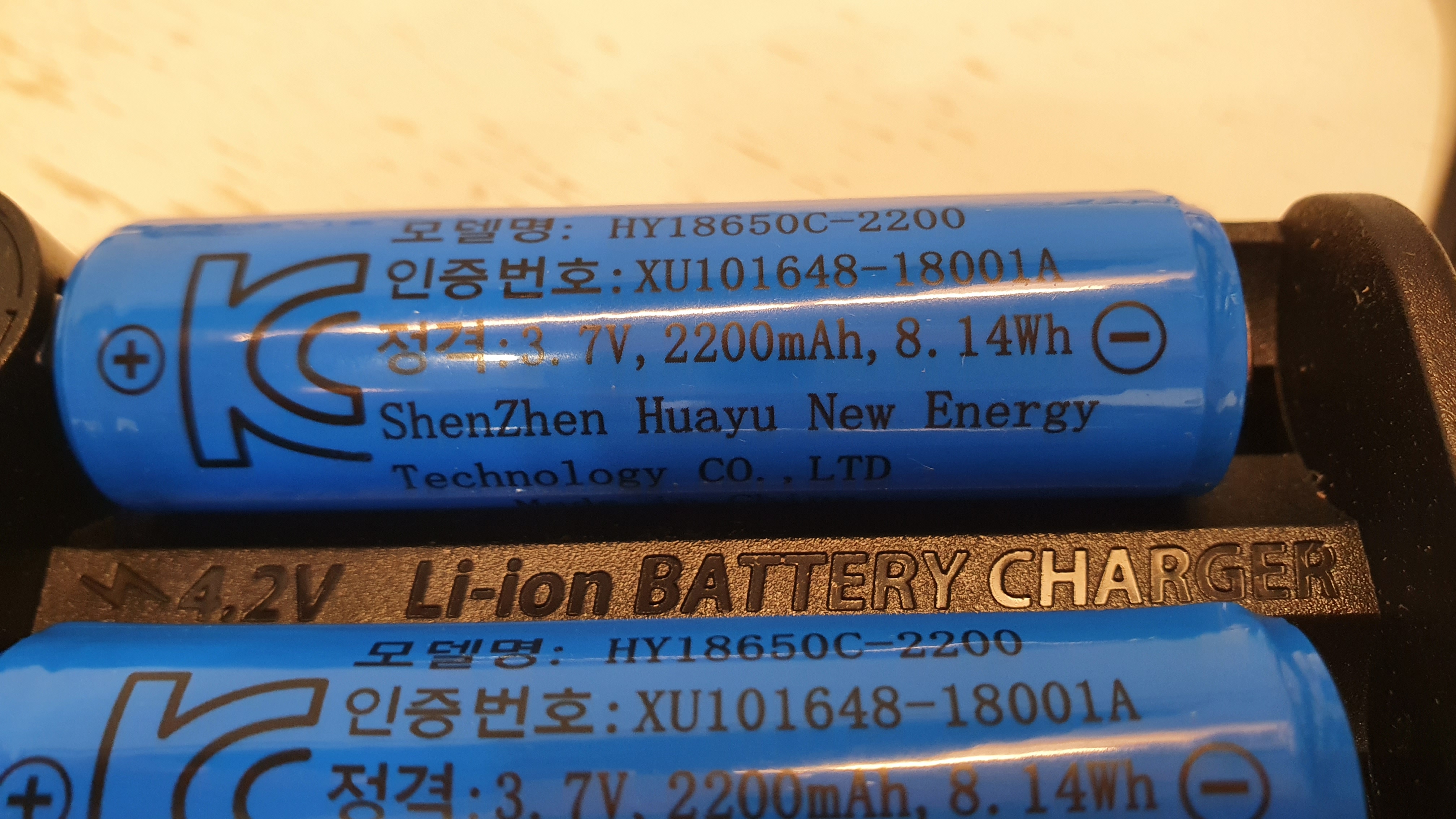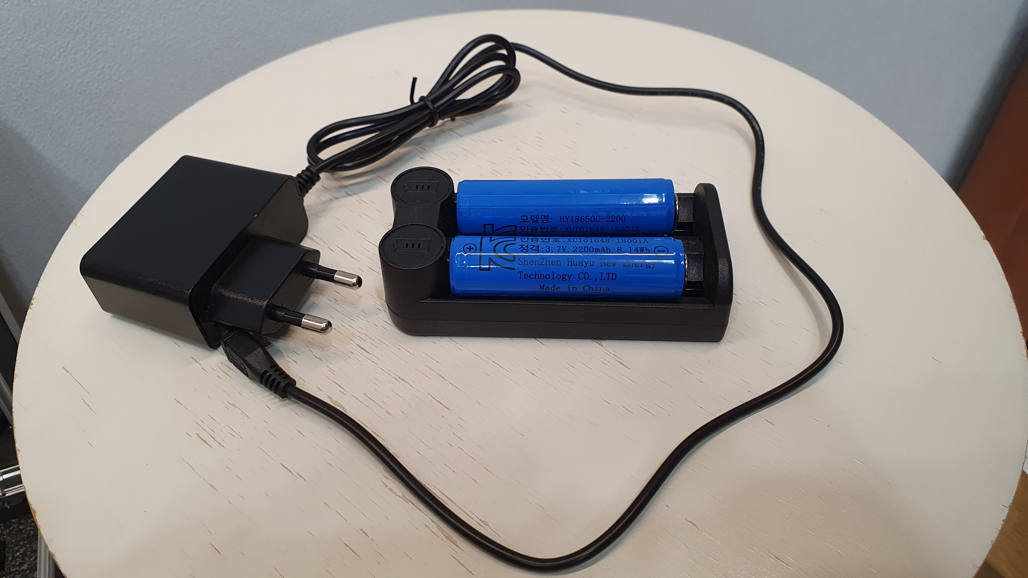 충전기는 아래와 같이 18650 규격의 배터리 2개를 동시 충전할 수 있는 크래들과 충전용 어댑터가 제공된다.