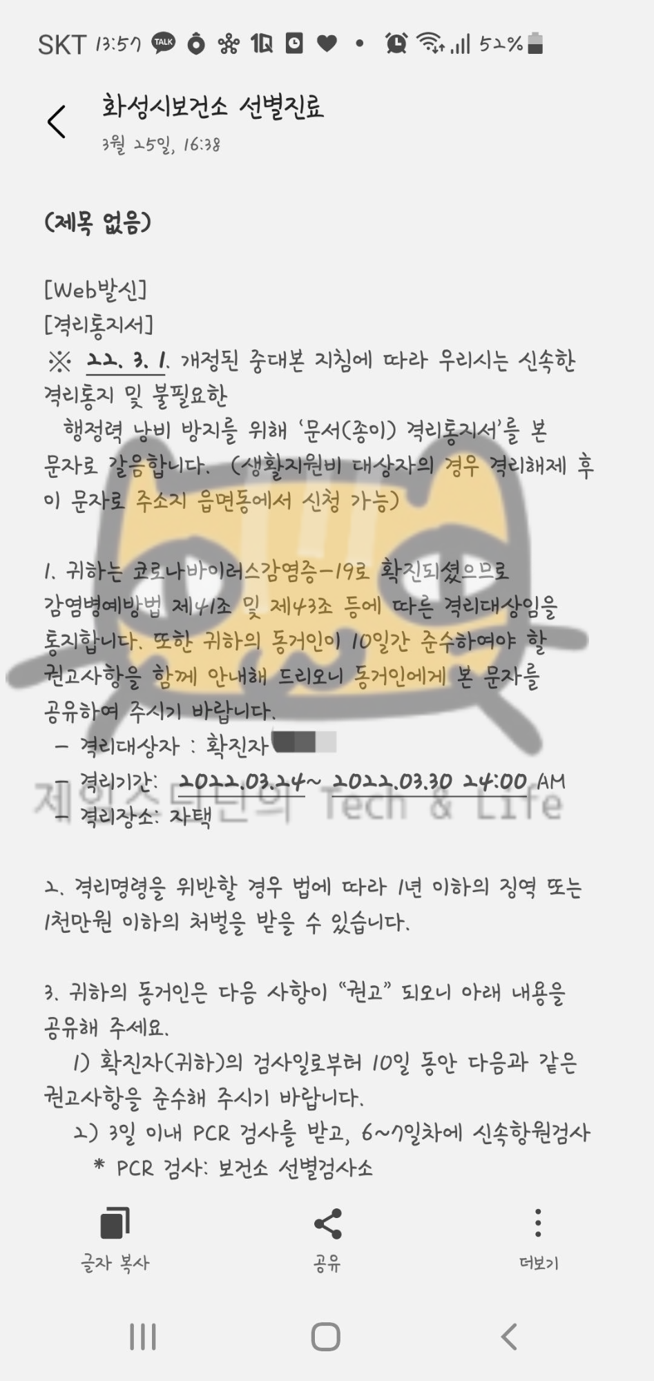 격리통지서는 문자는 동거인이 있다면 공유를 해주도록 한다. 이 문자가 동거인이 PCR 검사를 무료로 받을 수 있게 해준다. 격리대상자, 격리장소와 격리기간도 명시되어있다.