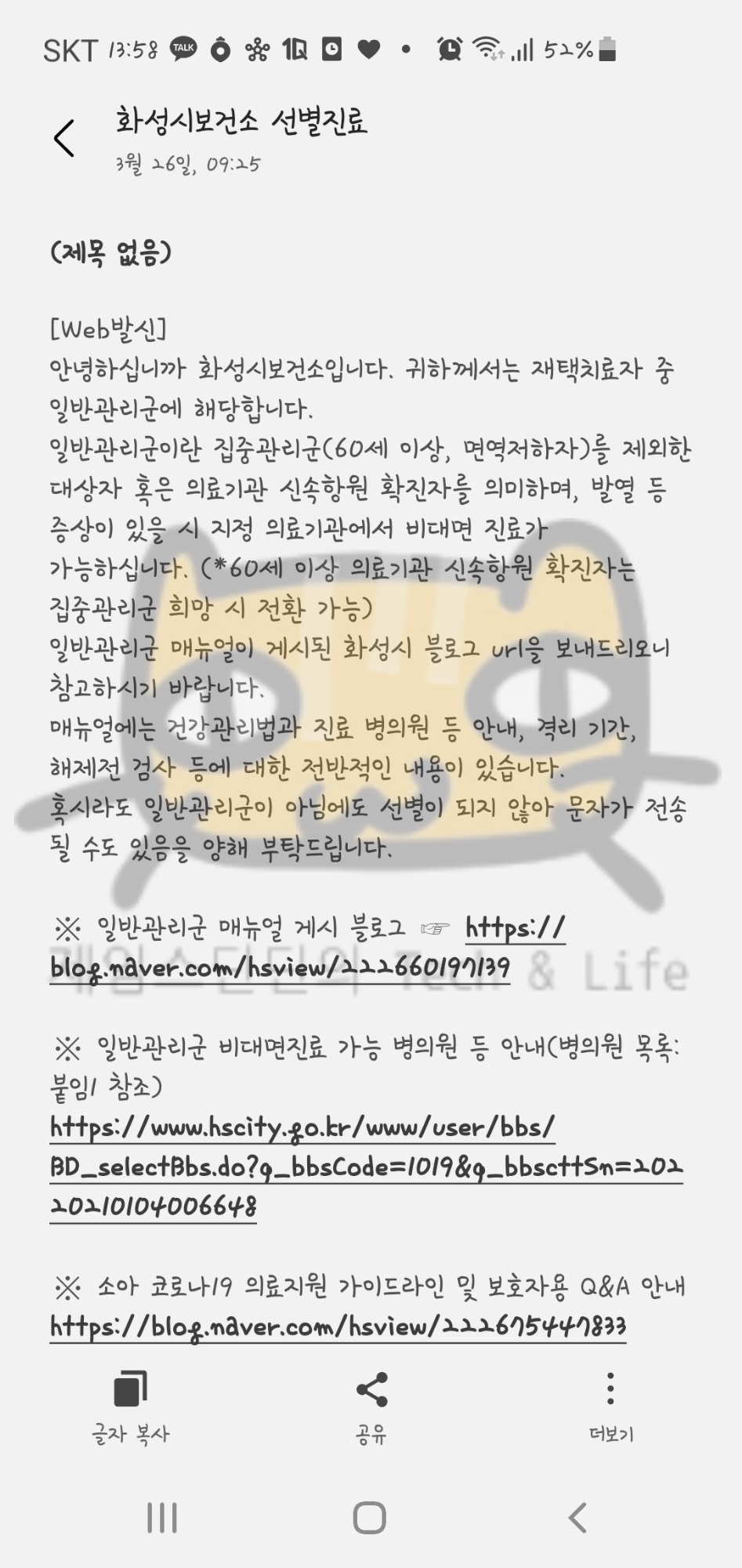 3일차에는 보건소로부터 내가 일반관리군임을 알려주는 문자가 왔다.
