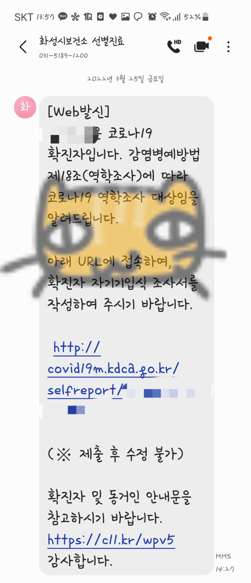 2일차에는 보건소로부터 확진자 안내 문자, 격리통지서 문자가 왔다.