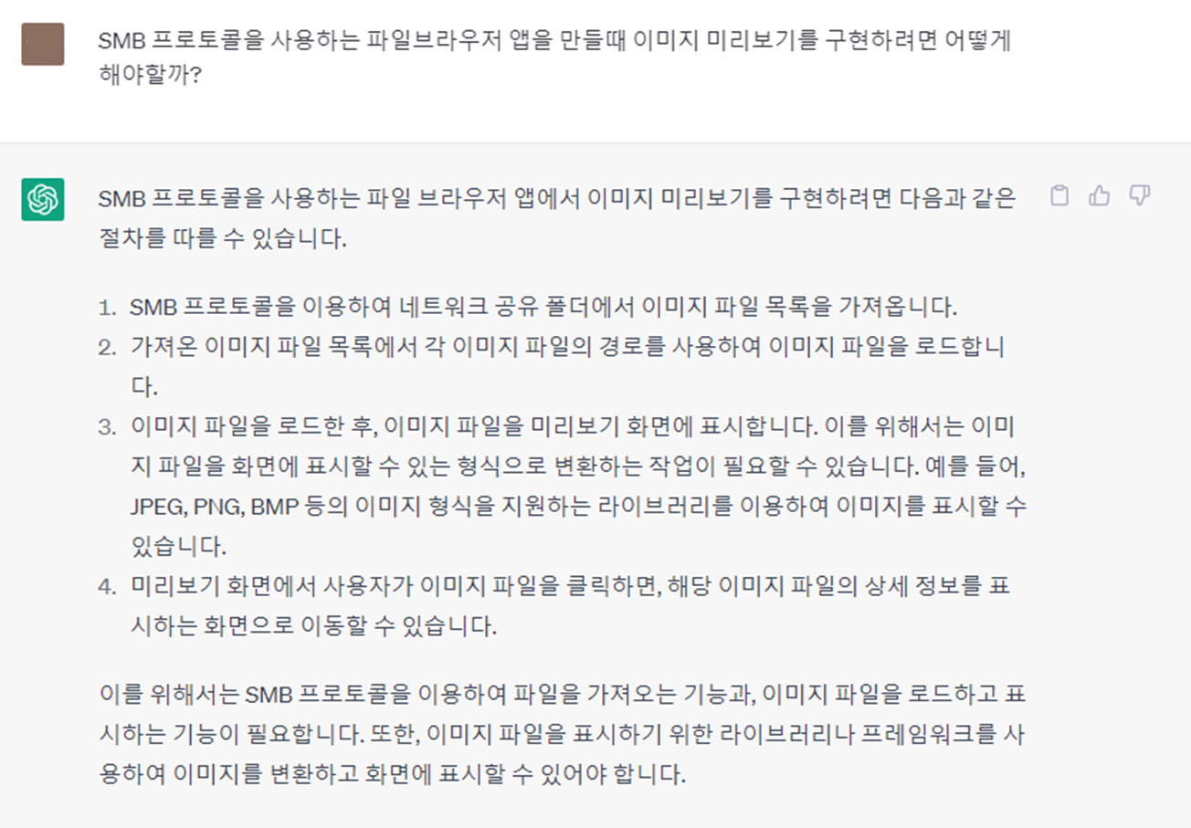 최근에 회사에서 SMB 프로토콜을 사용하는 네트워크 파일 서버에 연결하는 안드로이드 기반 파일탐색기 앱에서 '이미지 미리보기' 기능을 구현할 수 있는지를 빠르게 검증해보라는 상사의 요구사항이 있었습니다. 제 담당업무는 안드로이드 프레임워크의 Wi-Fi 부분인데, 관련성이 상당히 떨어지는 분야였죠. 그렇다고 SMB 프로토콜에 경험이 있는 상태도 아니었습니다. 그래서 ChatGPT 를 활용해 봤습니다.