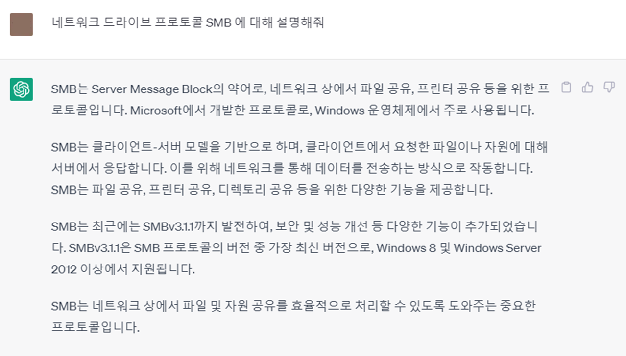 SMB가 대충 뭔지 감을 잡고, 아래와 같이 다시 ChatGPT에게 질문해봤다.