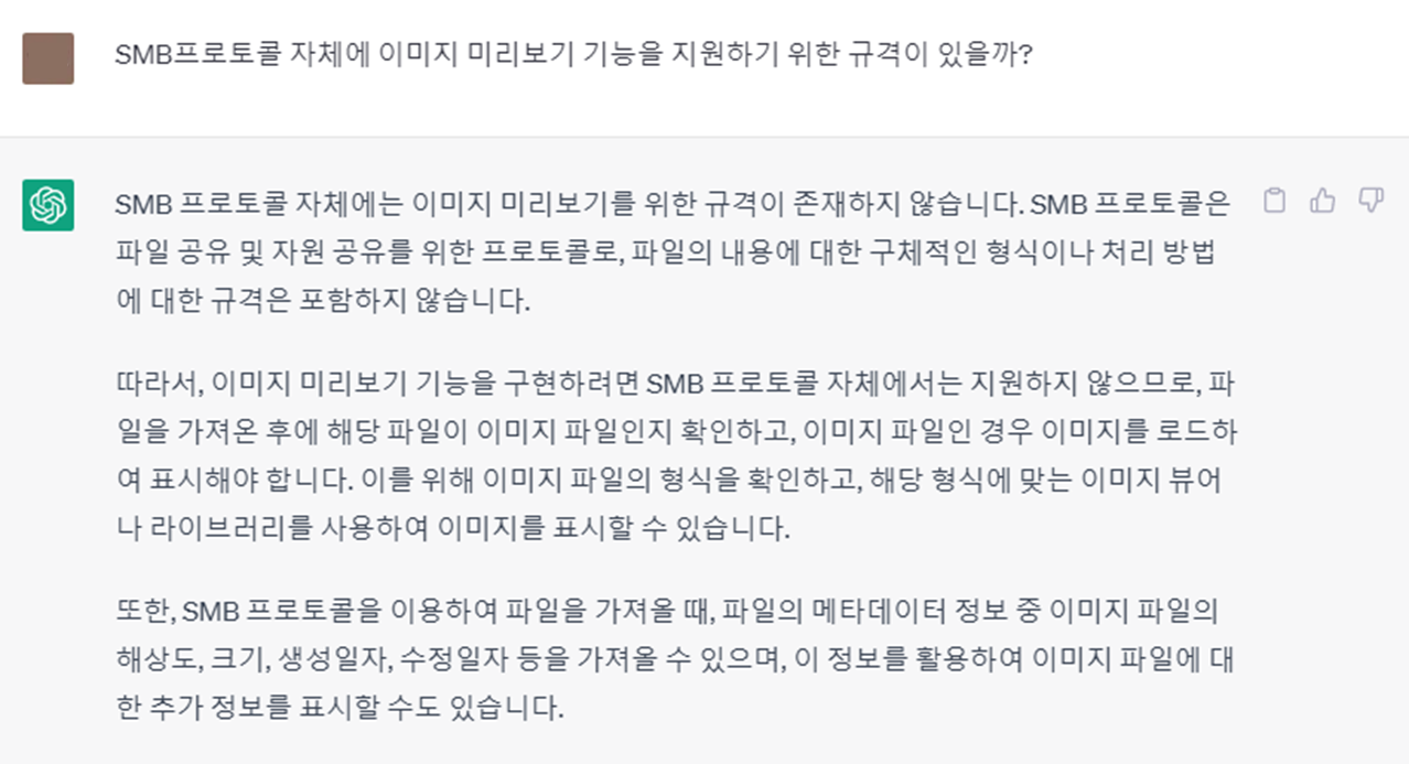 SMB 프로토콜 자체에는 이미지 미리보기를 위한 규격이 존재하지 않습니다. SMB 프로토콜은 파일 공유 및 자원 공유를 위한 프로토콜로, 파일의 내용에 대한 구체적인 형식이나 처리 방법에 대한 규격은 포함하지 않습니다.