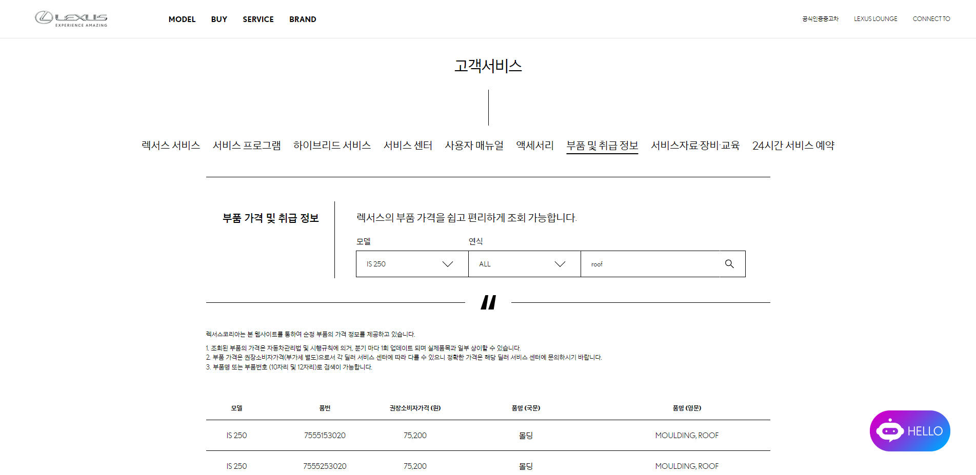 렉서스의 부품 가격 및 취급 정보를 편리하게 확인하실 수 있습니다.
