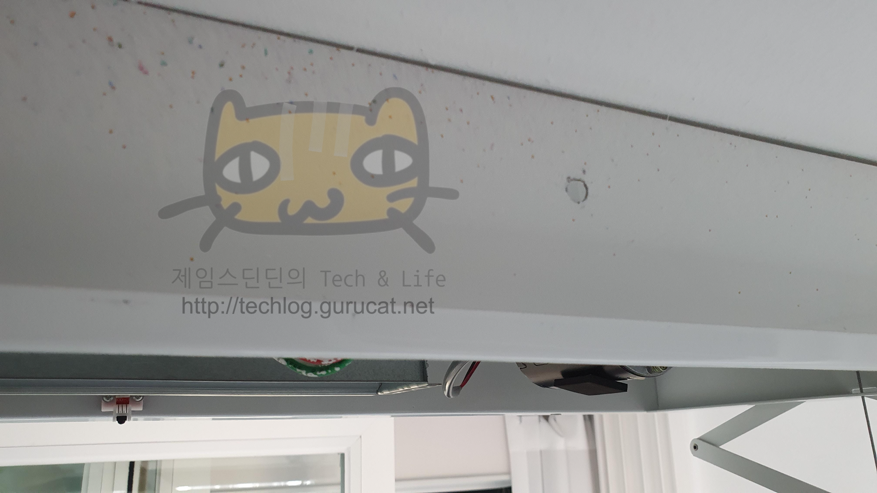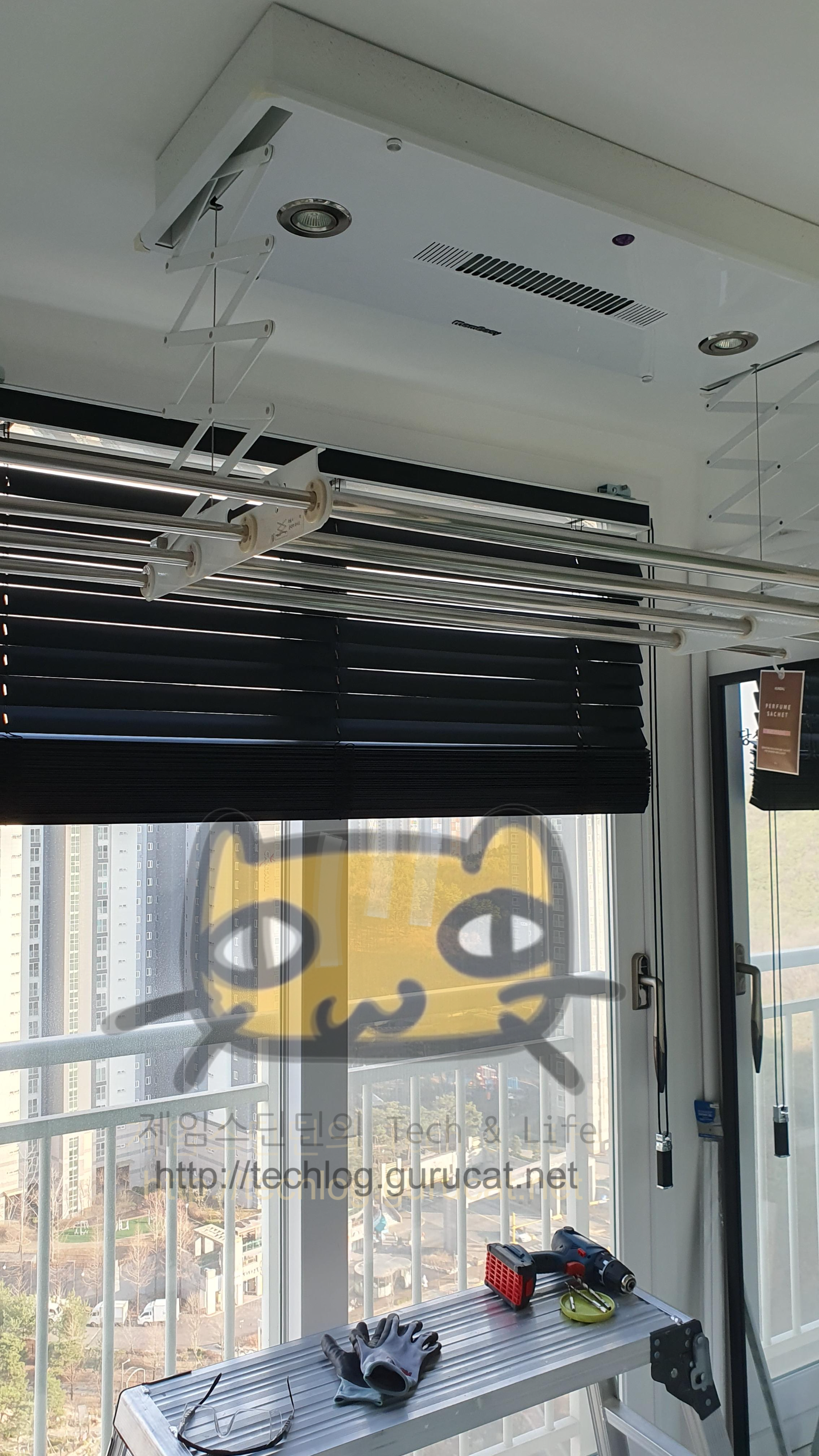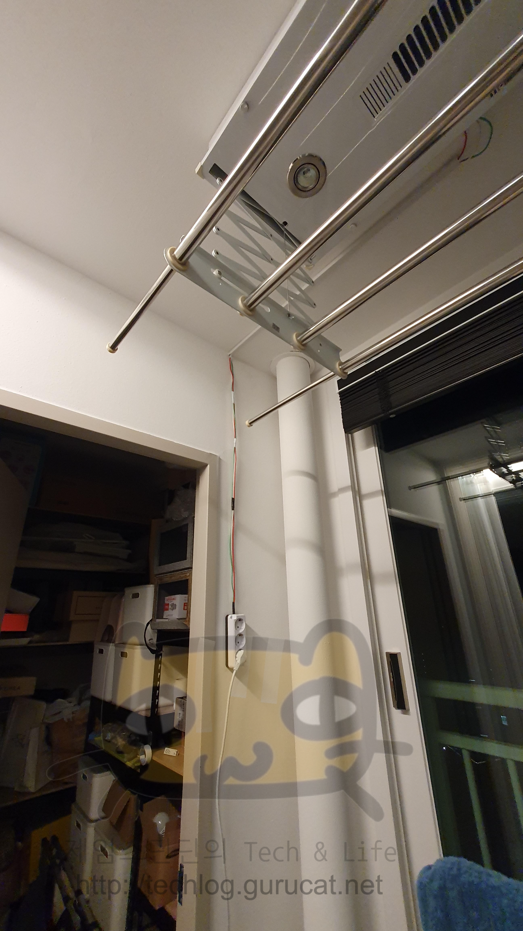 천장에 설치된 전동 건조대로 들어가는 전기를 분기시켜서 콘센트로 만들 것이므로, 전동 건조대를 열어본다.