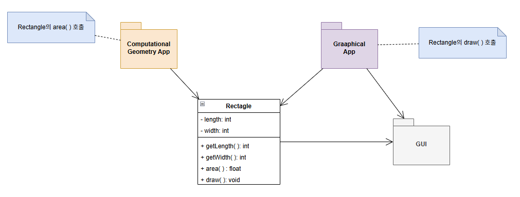 예를들어 위와같은 Rectangle class가 있다고 하자. 이렇게 가정된 상황에서 사각형의 넓이를 계산하는 앱은 area( )를 호출해서 사용하고, GUI로 사각형을 그리는 앱은 draw( )를 호출한다. 당장 보기엔 그럴듯 하다.