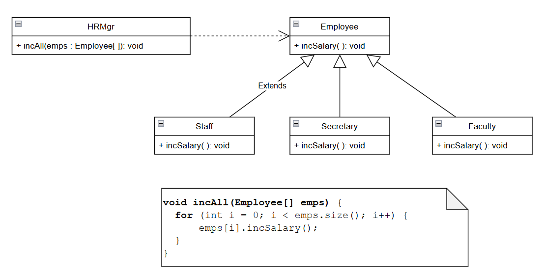 각 직원 유형클래스의 incSalary( ) 에서는 각자 알맞는 급여를 인상하는 코드를 구현하면 되고, Engineer가 추가되더라도 마찬가지이다. 이렇게 되면 HRMgr은 다시 컴파일 될 필요도 없다.