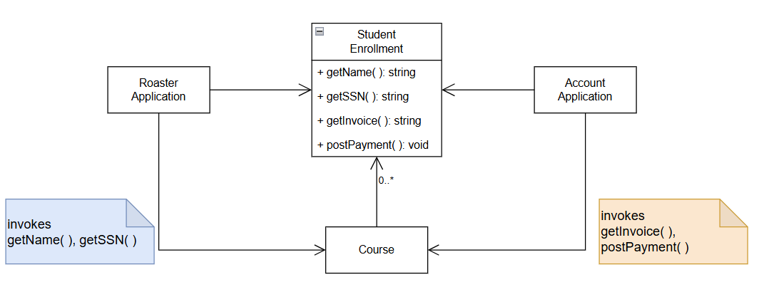 등록된 학생을 나타내는 StudentEnrollment라는 클래스가 있고, 이름, SSN, 송장번호에 대한 getter와 요금지불 동작을 메소드로 제공하고 있다고 가정하자.