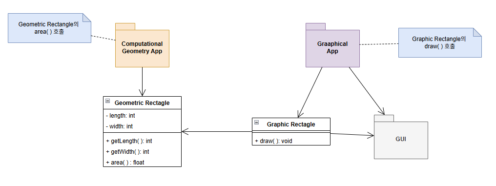 기존 Rectangle class는 Geometric Rectangle 이라는 class로 이름을 변경하고, 여전히 사각형의 길이와 너비를 갖고 area( )를 넓이를 계산하는 역할을 한다. 그리고, 사각형을 그리는 기능은 를 Graphic Rectangle 이라는 별도의 class로 분리했고, draw( ) 메소드는 Geometric Rectangle을 참조해서 가 GUI를 그릴 수 있다.