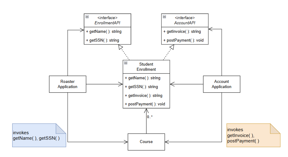 이제, StudentEnrollment 객체의 각각의 사용자(Roaster Application과 Account Application)에게는 사용하는 메소드들만을 제공하는 인터페이스가 주어졌다.