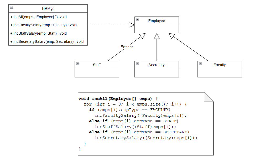 HR매니저는 incAll( ) 이라는 메소드의 인자로 모든 직원들의 목록을 받아, 각 직원클래스의 타입을 확인하고 타입에 맞는 급여액을 인상하는 메소드를 호출하도록 구현했다.