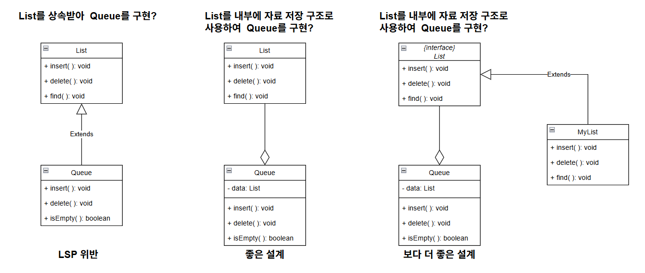 만약 List를 상속받아 Queue를 구현한다면, Queue는 List를 대체 할 수 없으므로, LSP를 위반하게 된다.